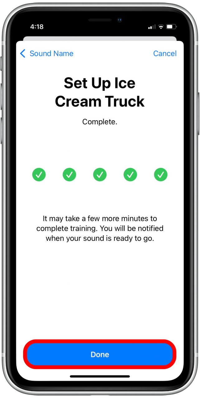 - You will have to record the sound five times. Each time an alarm is detected, a blue check will appear for each circle. Tap Save Sound.