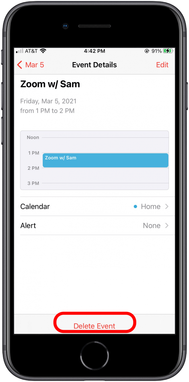 Deleting events from your iPhone calendar is a simple process—with a few quick taps you can clear clutter of canceled appointments. There are two types of events you might want to delete from your iPhone: a single event and an event series. A single event is a one-time event saved in your Calendar app (such as your call with a friend). An event series is a recurring event (like your weekly coffee meeting on Fridays). In either case, the process is the same except that deleting a recurring event requires an extra step.