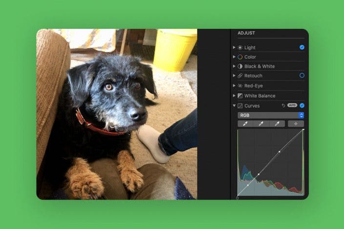 - Click the arrow next to Curves, then click Auto, and the Photos app will automatically balance the red, green, and blue in your photo.