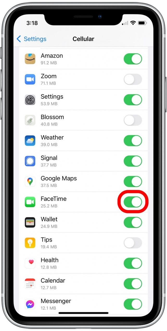 - Scroll down and tap the FaceTime toggle to allow the app to use cellular data.