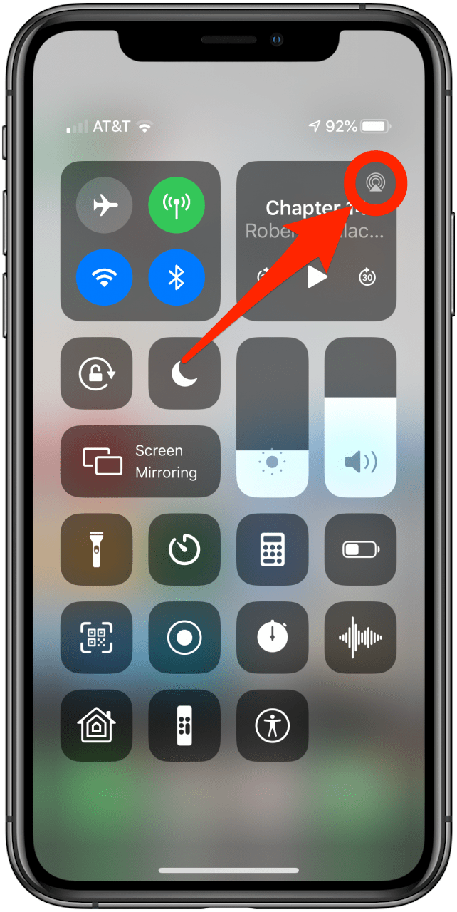 - Open the AirPlay menu, which you can access by tapping the AirPlay icon here pictured in the control center, but also available in your audio player app.