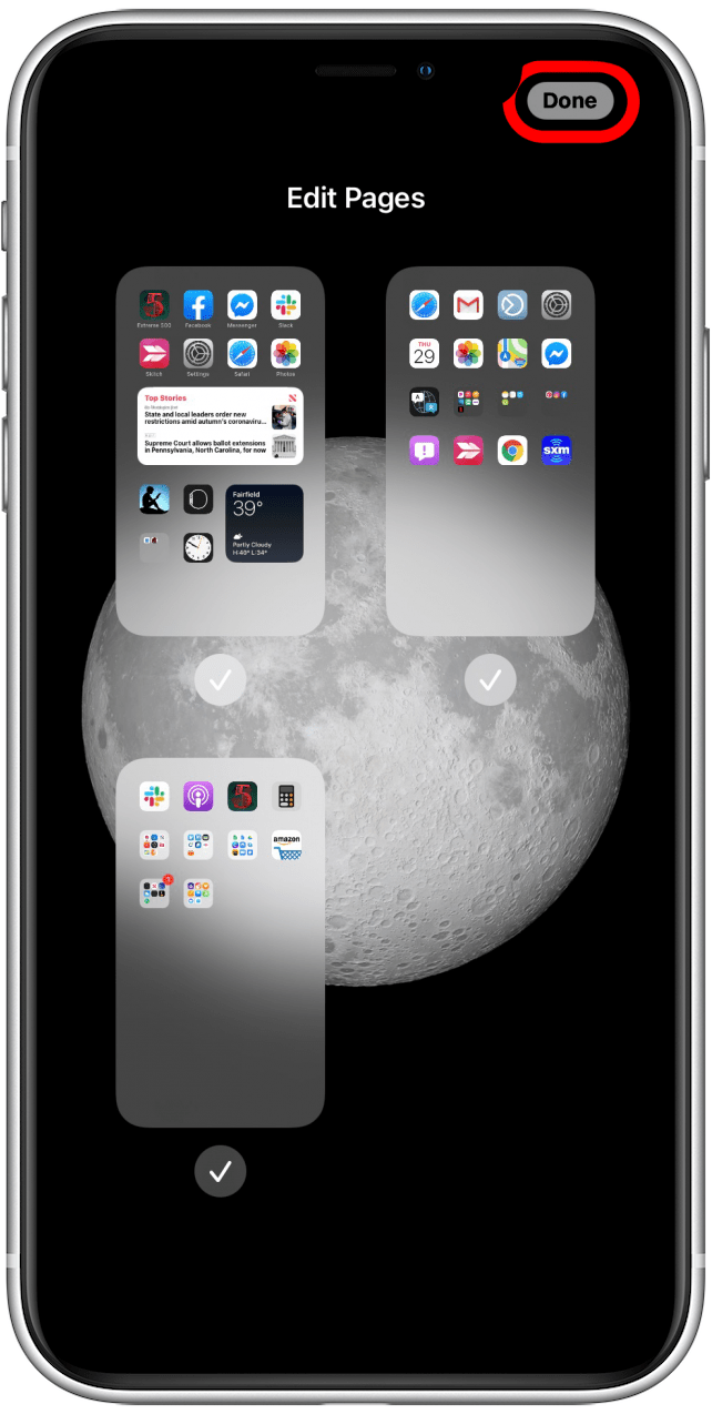 - You'll see an array of your Home Screen pages. Locate the hidden page, which you'll notice will not have a check mark in the bubble below it. A hidden page will also be blurred slightly.