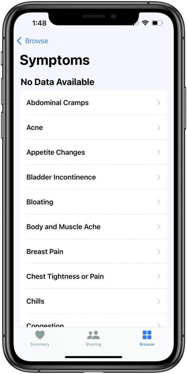 If you have a specific area of health you’re interested in tracking, you can likely do so in your Health app. When you open the Health app and tap Browse, you’ll see various Health categories, such as Heart, Mindfulness, Nutrition, and Symptoms. Tap a category to start tracking or setting specific health goals. For example, you can use the Symptoms category to help you track recurring issues to show a health professional, such as chest tightness, headaches, or nausea. In the end, the specific areas you’d like to track will relate to your current health goals and concerns. You can also manually add data to your Health app if needed.