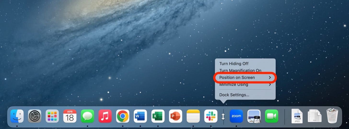 - You can move the Mac Dock to any location (except the top of your screen) by right-clicking the Dock and selecting Position on Screen.