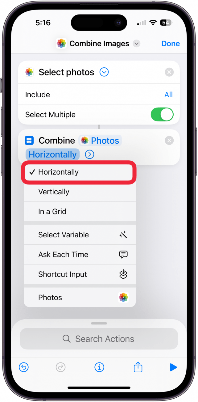 - In the Combined Images section, make sure the mode field is set to Horizontally. If not, tap on Horizontally to change it.