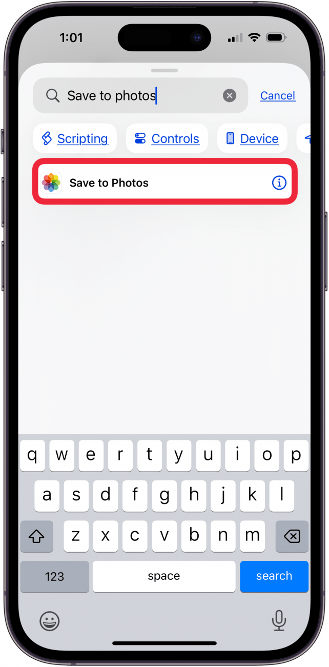 - Tap the Search Bar at the bottom of the screen. Search for and tap Select Photos.