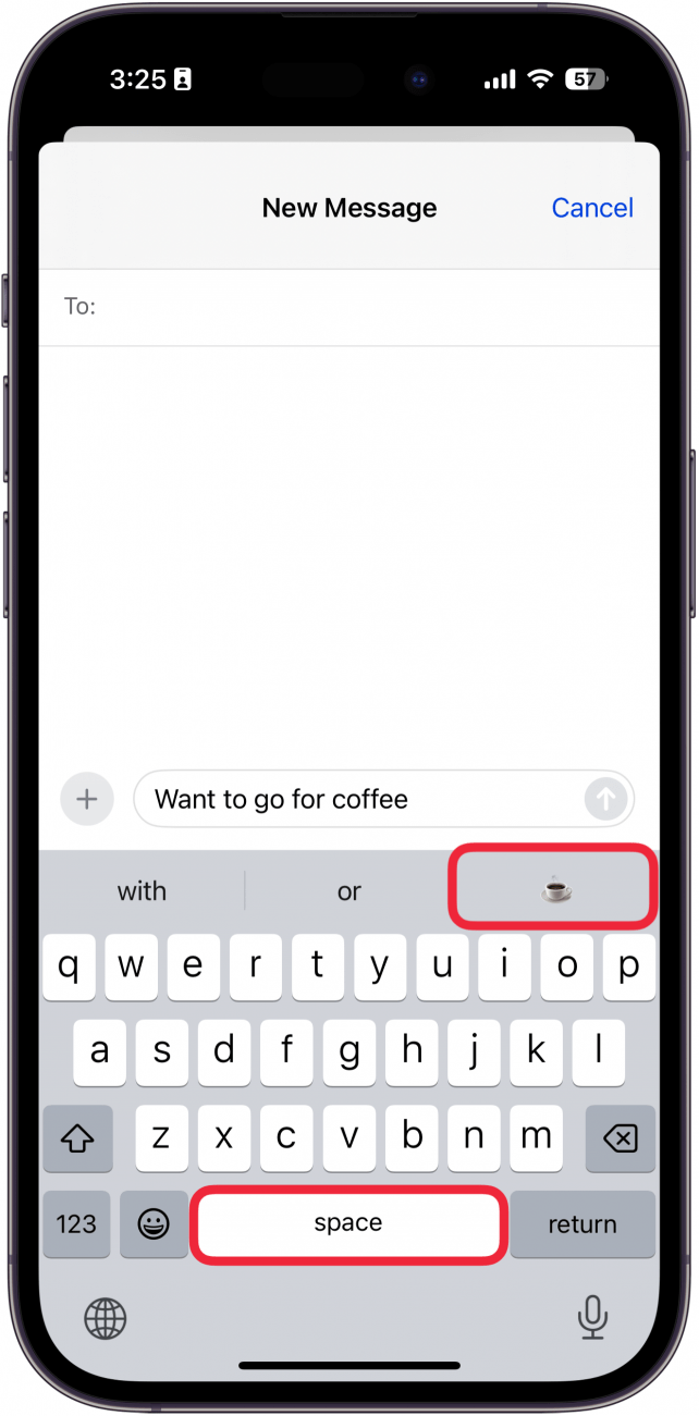- If you want to follow a word with a suggested emoji, add a space after the word and then tap the emoji.