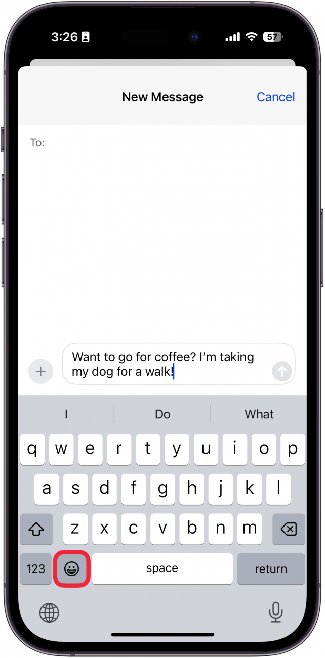 - If you want to add your emojis all at once, type the entire message and then tap the emoji icon in the bottom left of your keyboard (it may be in a slightly different position if you have multiple keywords).