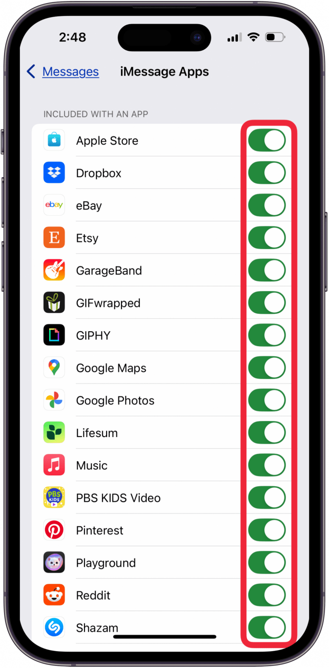 - From here, you can toggle off apps you do not want to appear in the Message App bar. Scroll down the page to see more options to turn off.