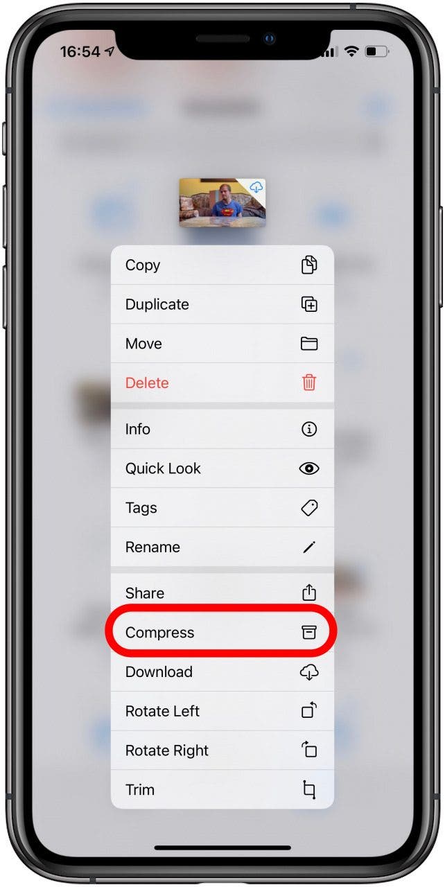 - Tap and hold the file until a menu appears. Then tap Compress.