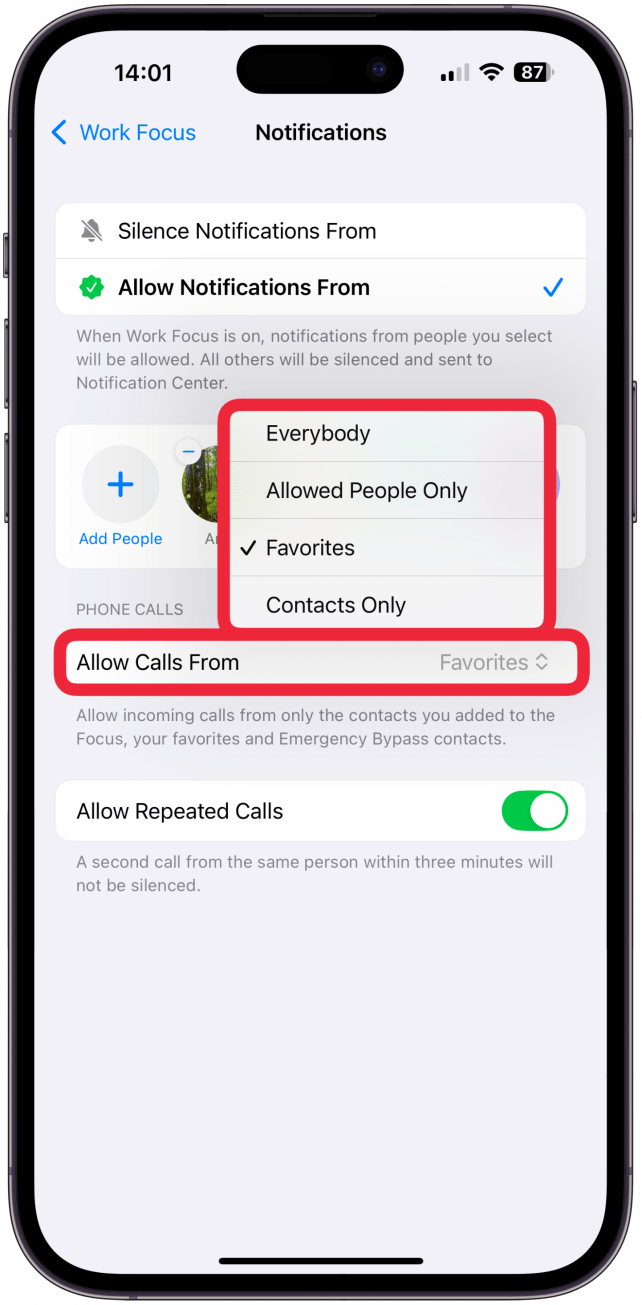 - If you select to Allow Notifications From certain contacts, you'll be able to select who you wish to allow calls from. Tap Allow Calls From and make your selection between Everybody, Allowed People Only, Favorites, or Contacts Only.