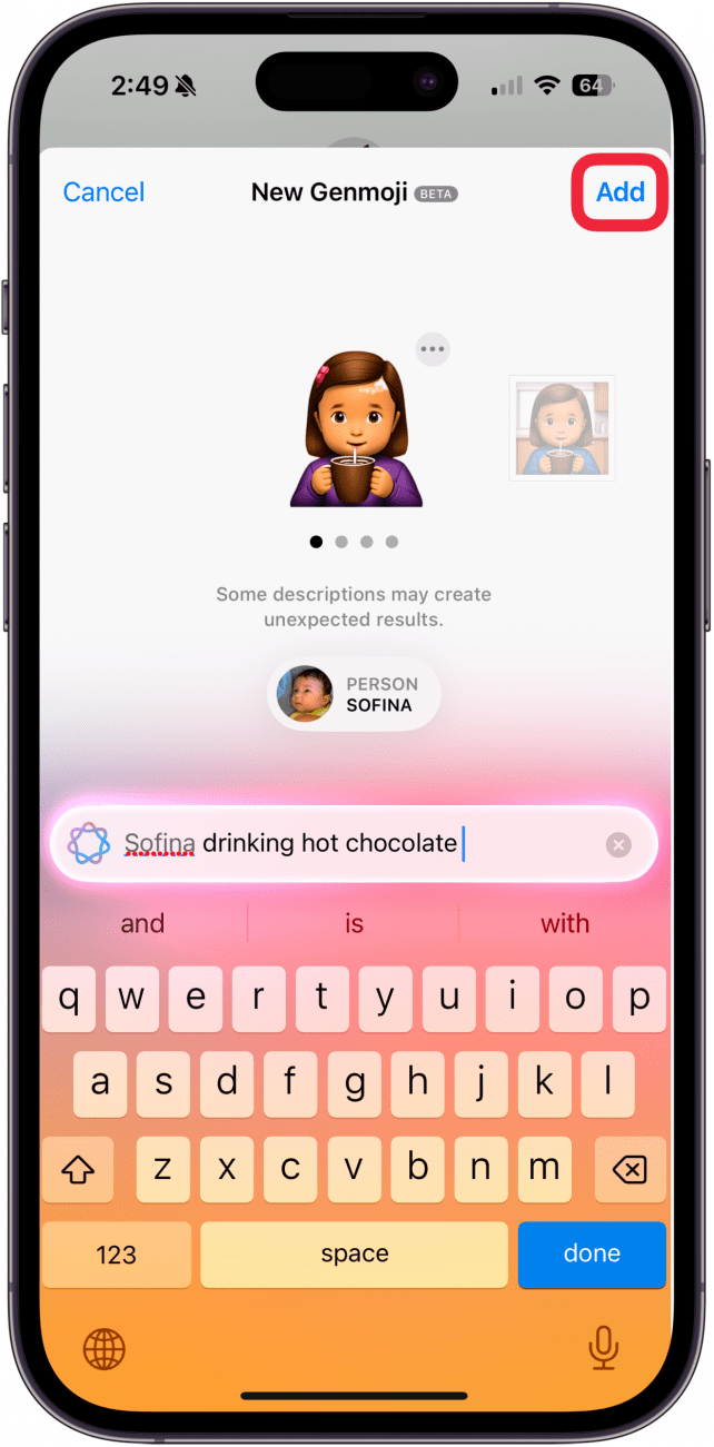 The Genmoji will now be in your emoji keyboard and can be used wherever you can use emojis.