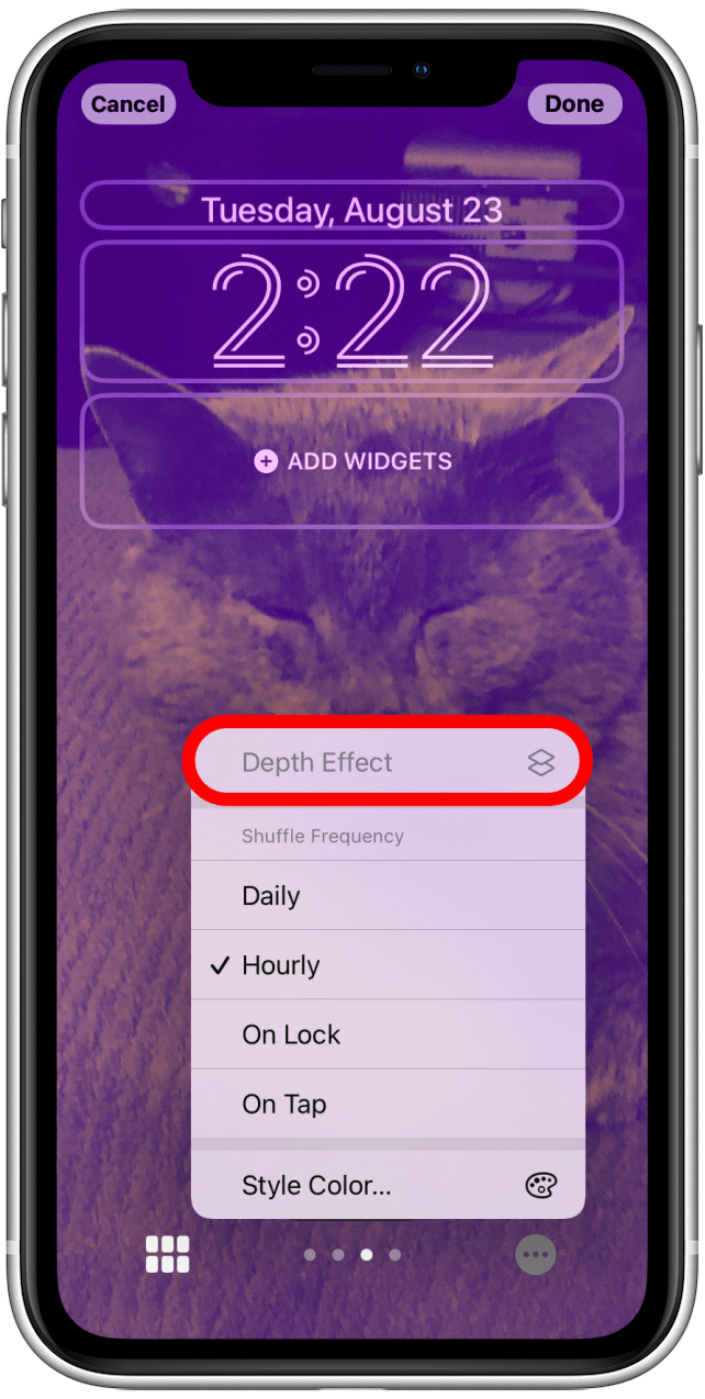 - If using Duotone or Color Wash, you change the color of the Lock Screen by tapping Style Color.