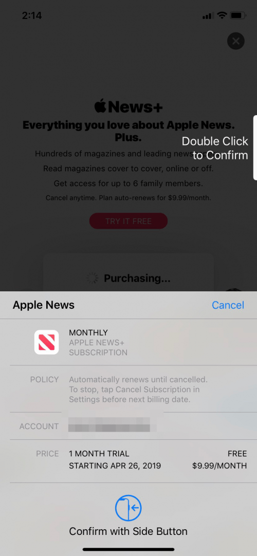 - The next screen will explain a few details about Apple News Plus, including billing. Tap Try It Free.