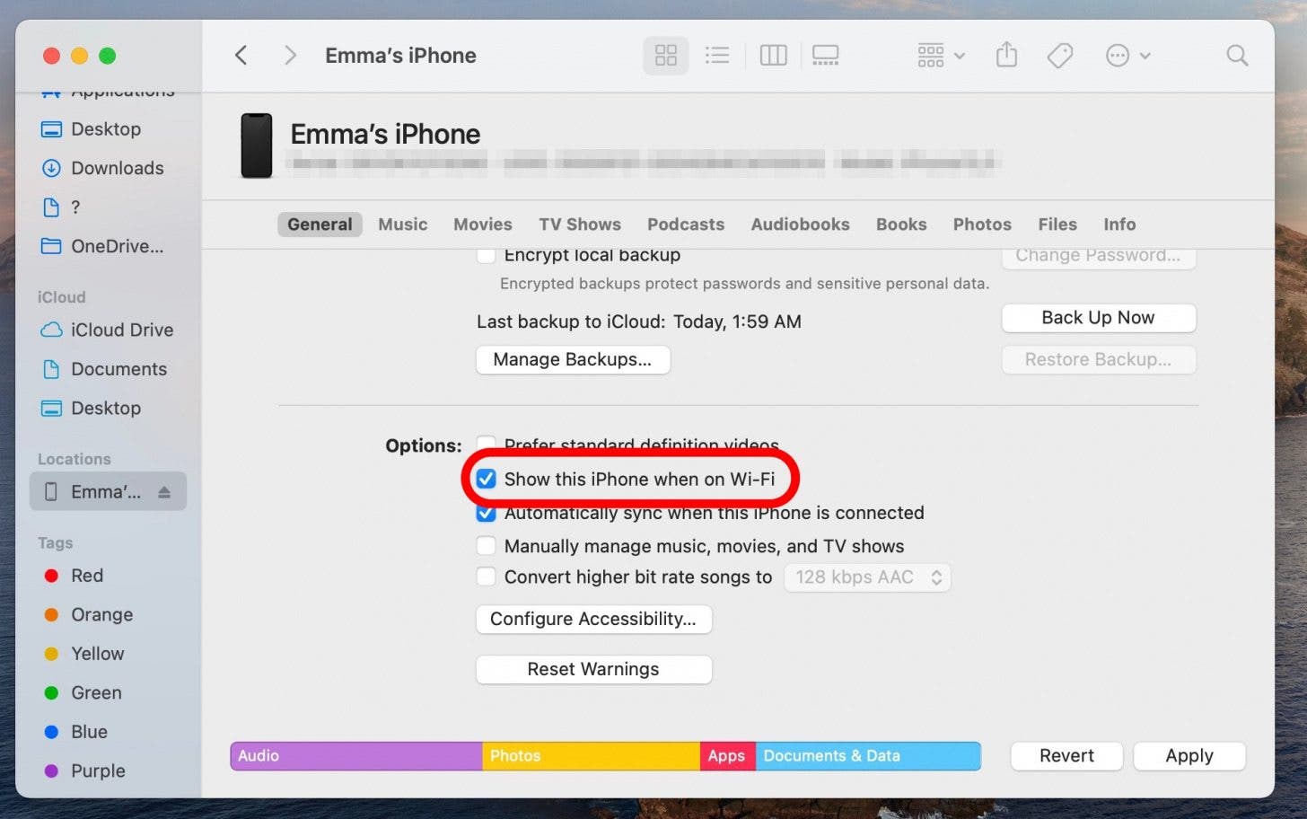 The first time you sync your iPhone to your Mac you will need to use a cable to connect the two. After the initial setup you can choose to activate syncing via Wi-Fi, which allows you to sync iPhone content to Mac without a cable. Follow the steps below to sync your iPhone to your Mac.