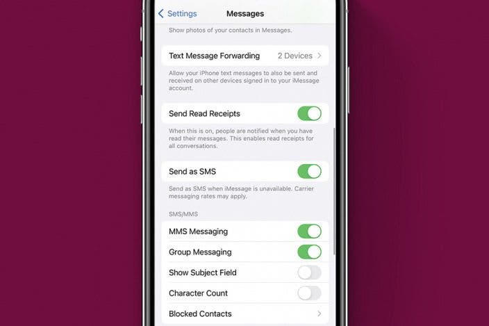 Now you know how to turn off Read Receipts on iPhone, how to turn on Read Receipts on iPhone, and how to turn Read Receipts on or off for individual contacts. As long as the people you text have this feature enabled, you'll be able to see if and when they've read your message. To learn more about the Messages app, sign up for our free Tip of the Day newsletter.