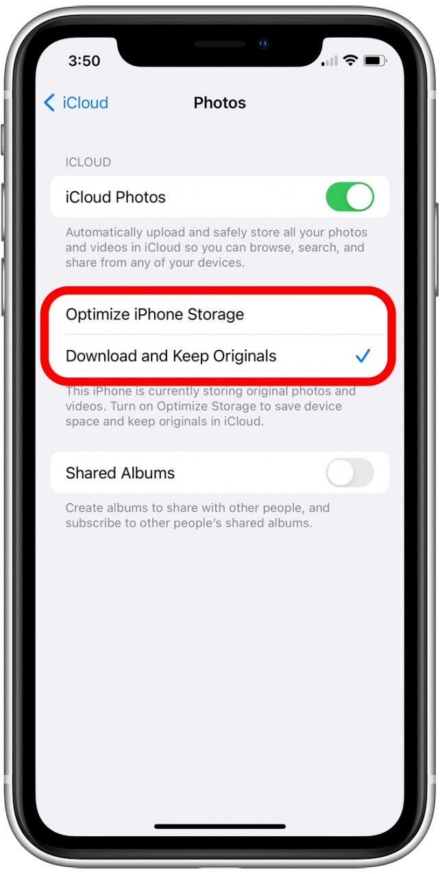 - Then select either Optimize iPhone Storage or Download and Keep Originals.