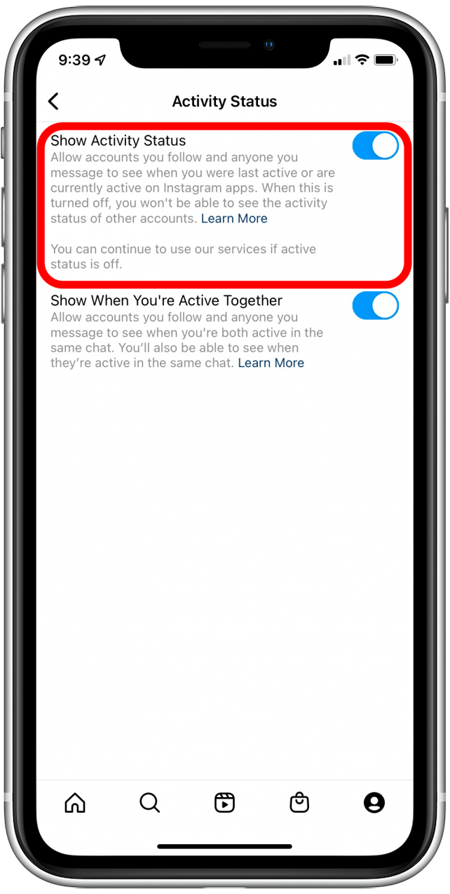 - You will have two options on how to turn off the active status on Instagram. Tap the toggle button next to Show Activity Status. Disabling this setting will automatically turn off the second option, Show When You’re Active Together.