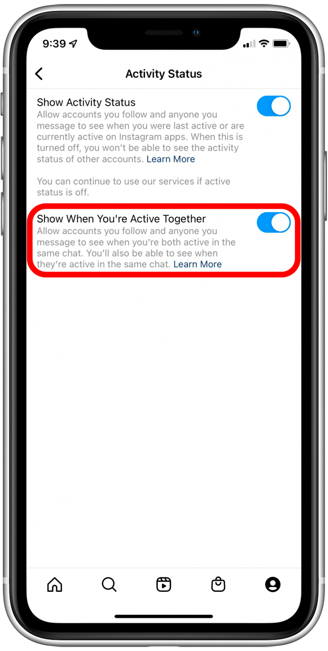 - To turn off your Instagram active status in direct-message chats, tap the toggle button next to Show When You’re Active Together. In that way, people you message won’t be able to see when you are active in the same chat.