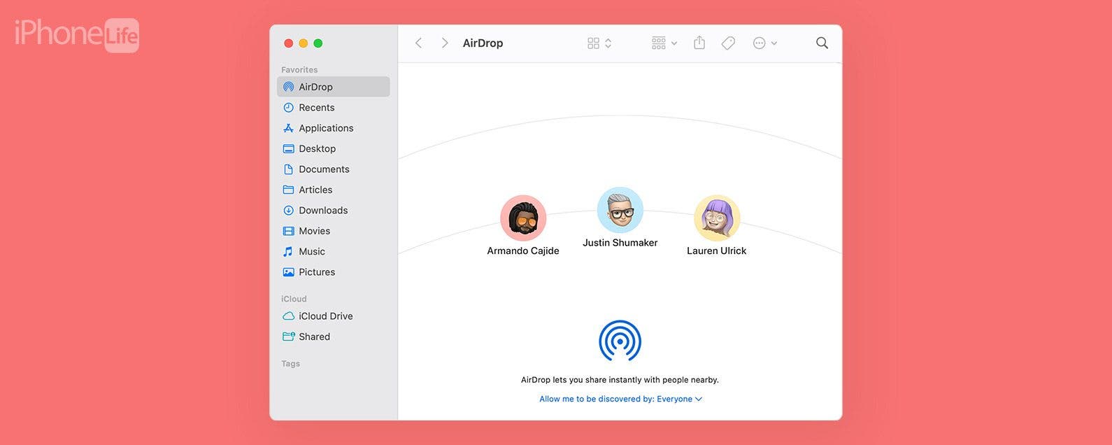 - Next to "Allow me to be discovered by" click No One, Contacts Only, or Everyone. I have my Mac AirDrop set to Contacts Only, so I don't receive AirDrops from strangers.
