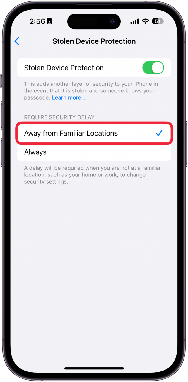 - Select Away from Familiar Locations if you want your device to only enforce the security delay when you're not at home or work.