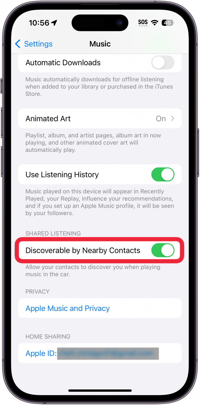 - Scroll down and tap the toggle next to Discoverable by Nearby Contacts.