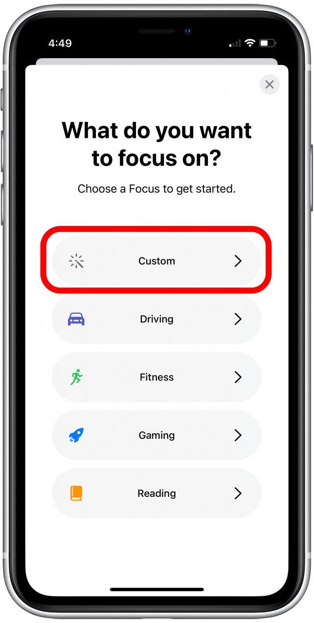 - Tap one of the category labels below, or tap Custom to add a new Focus.