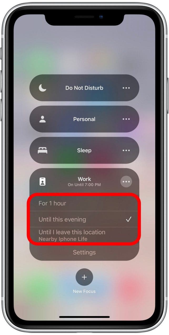 - From here, tap to select whether you want notifications to be blocked for one hour, until this evening, or until you leave your current location.