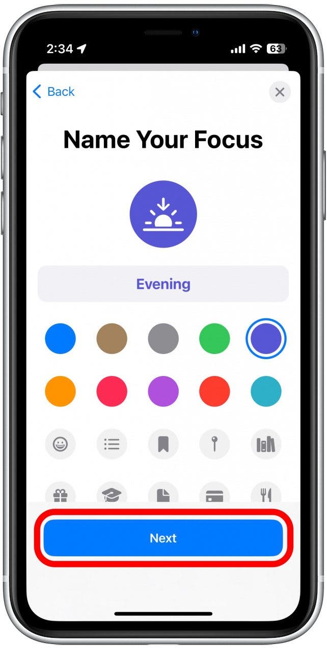 - Type in the name of your custom Focus setting, and choose an icon and color to represent how this Focus will be used. Then, tap Next.