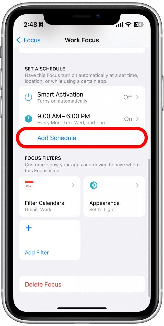 - Tap Add Schedule to set your Focus to enable at certain times or at specific locations.