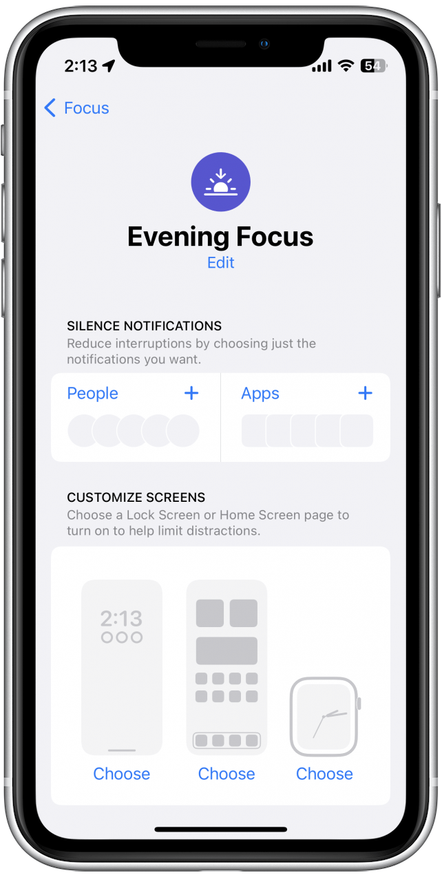 - Tap Edit (or Choose if this is your first time customizing this Focus) underneath the Lock Screen and Home Screen icons to customize the wallpaper for this Focus.