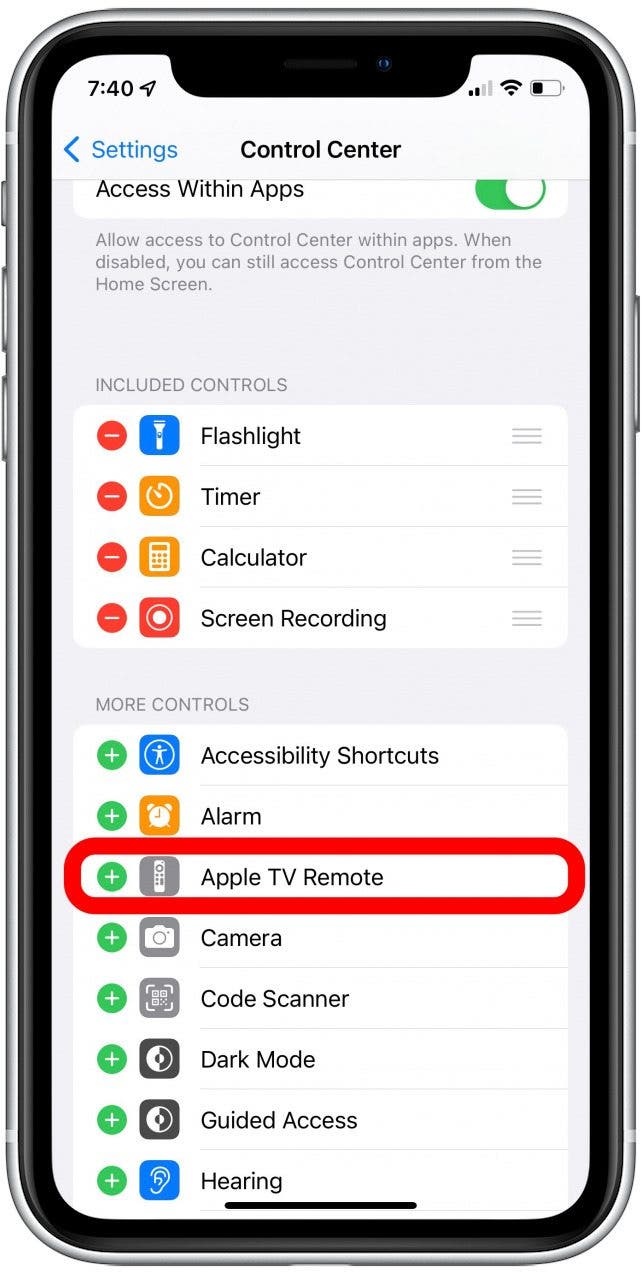 - Tap the green plus next to Apple TV Remote to add it to Control Center.