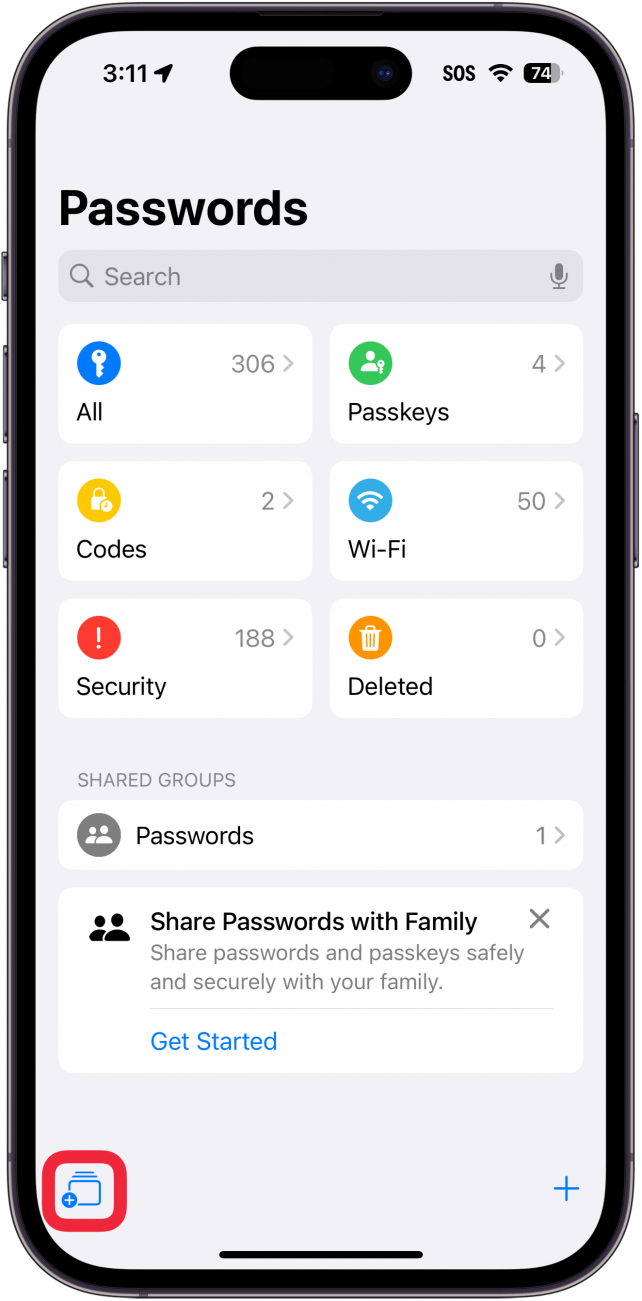 - On the home page, tap the square icon with a plus next to it to create a new password-sharing group.