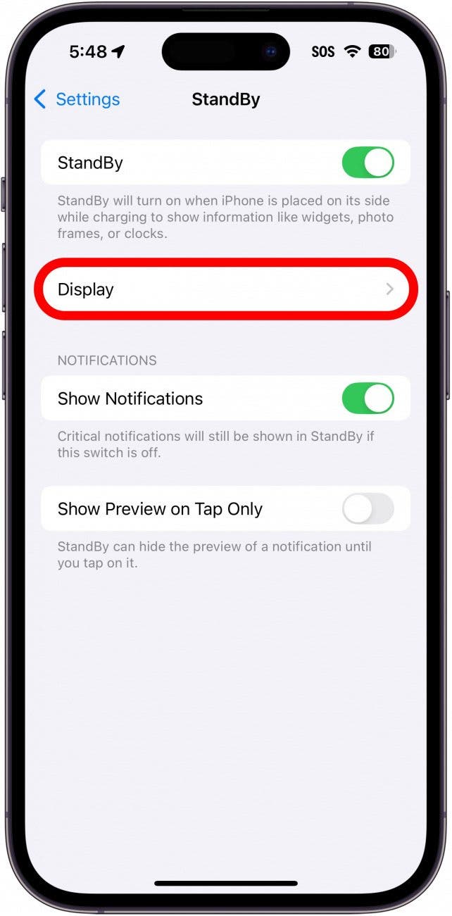 - Lastly, you can tap Display. Note: This option only appears on Pro iPhones. If you do not have a Pro iPhone, you will instead see a toggle labeled Night Mode. The Night Mode toggle is explained further in step 7.