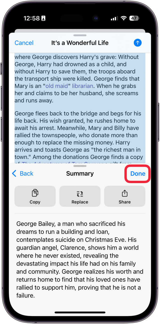 - You’ll see a single paragraph summary of your text. You can select Copy to copy the summary, Replace to replace your text with the summary, or tap Share to share the summary with others.