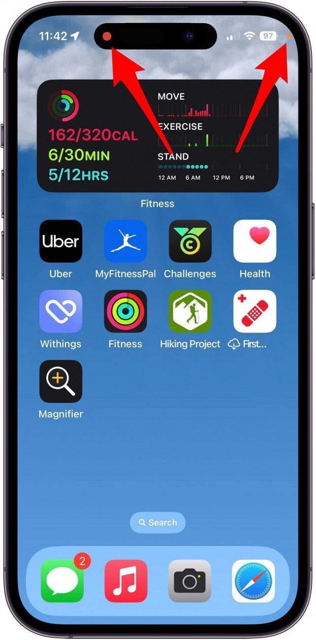 - You will see a red dot in the Dynamic Island which indicates that a recording is active, and an orange dot in your status bar, indicating that the microphone is in use. If your iPhone does not have a Dynamic Island (iPhone 14 and earlier), the clock will have a red background and you'll see the orange dot near your network connection instead. When ready to stop recording, tap the red dot in the Dynamic Island.