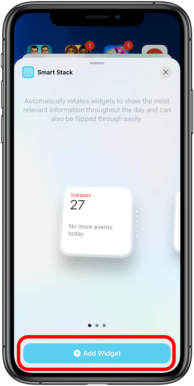 A Smart Stack is a Widget Stack made of widgets your iPhone thinks you will find interesting. For example, if you check the news and weather every morning, it will probably include those widgets in your Smart Stack. If you look through your Photo Library a lot, you may find Featured Photos as part of the lineup, too. To add a Smart Stack to your Home screen: