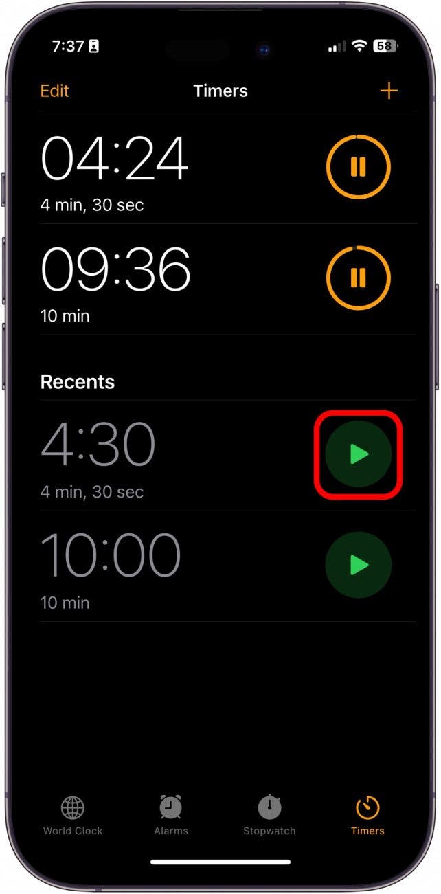 - You can also quickly start a new timer by tapping the Play button next to your recent timers.