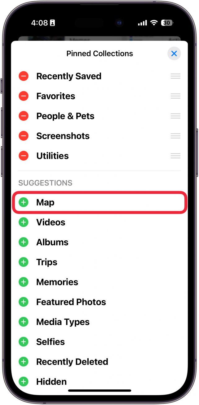 - Under Suggestions, you can tap the green plus icon to pin a collection.