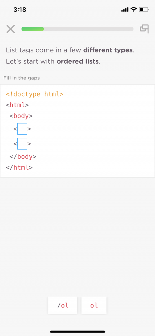 When you select a Track to follow, the Mimo app starts you out at an absolute beginner level. I highly appreciate this, because I feel like it’s easy to stop coding before you ever really begin. But when you can learn in digestible bites of information, your curiosity fire is fanned to a flame. The app doesn't ask you to answer questions you don’t yet know the answers to; instead, it educates you while asking you to interact all along the way. At the end of each section, the app asks you to apply what you’ve learned.