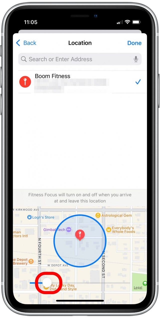 In short, a geofence is a virtual perimeter set for a real-life geographic location. When you set a Focus Mode to activate at a specific address or business name, a virtual perimeter is set for that area. Then, whenever you cross that virtual perimeter, your iOS 15 Focus Mode is activated. Sometimes though, the geofences are poorly set. If a geofence is too large, your Fitness Focus Mode might activate as you are driving down the same street your gym is on. If a geofence is too small, your Focus Mode might not activate even if you are at the location. The good news is that you can adjust the size of your Focus Mode geofence by simply sliding a toggle.