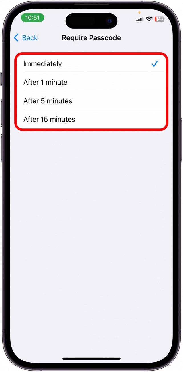 - Select a time that feels appropriate to you. For instance, Immediately will require a passcode everytime you close the app.