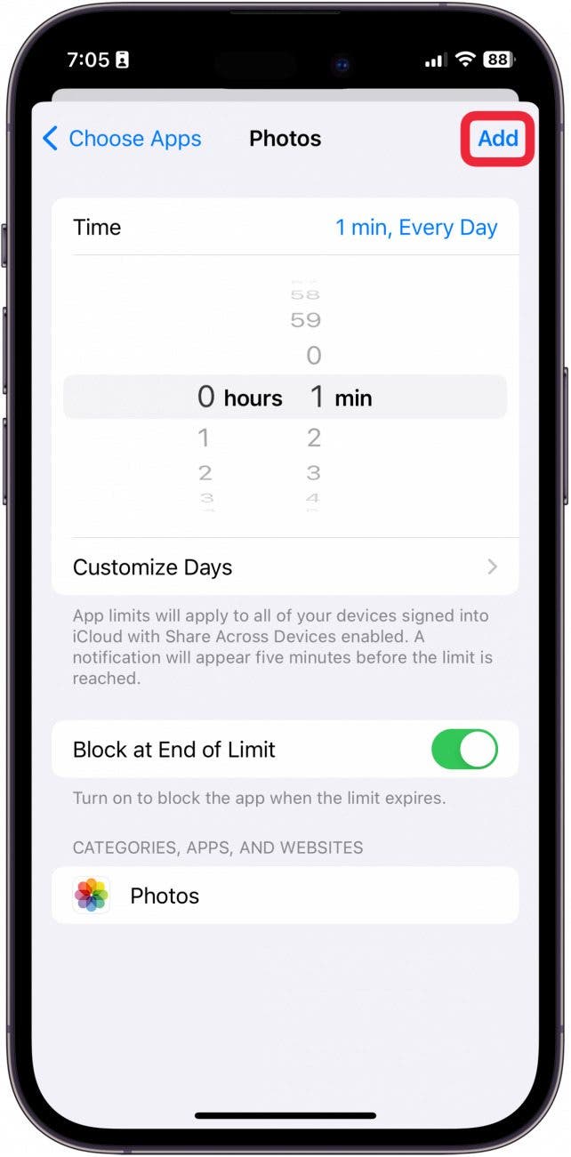 - Then, tap Add to save the limit. Now, the Photos app will automatically lock after one minute of use.