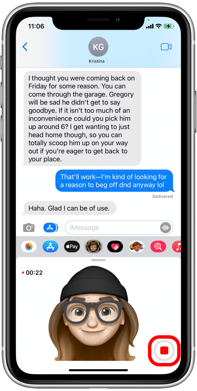 - Record your message, and be sure to have fun with facial expressions to take full advantage of your Animoji's capabilities!