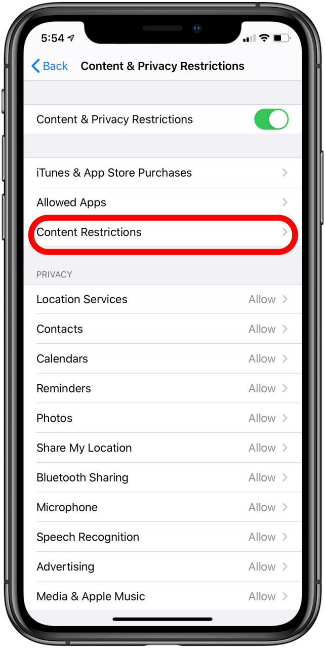 - Toggle on Content & Privacy Restrictions at the top of your display.