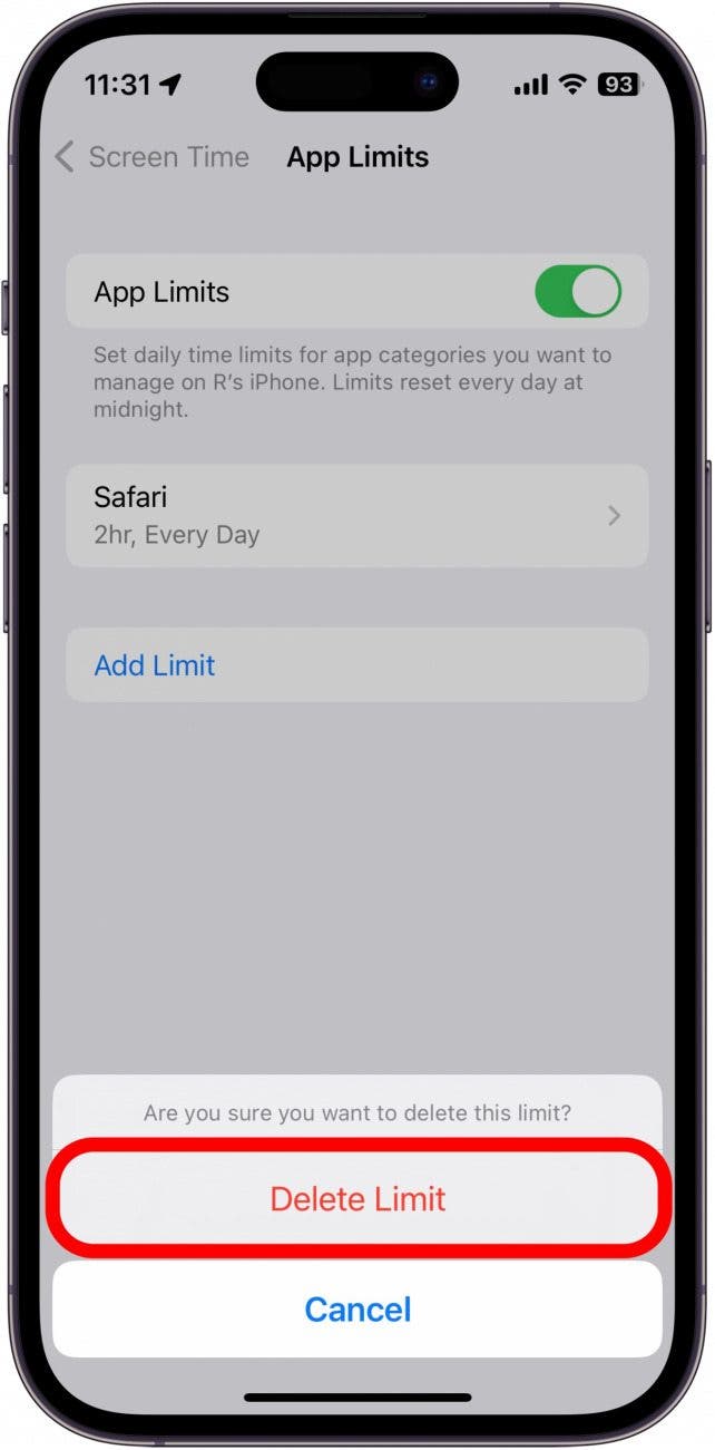- Tap Delete Limit to confirm.
