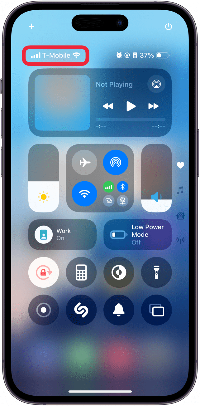 - In the top left corner, you’ll see your cell carrier and your connection status. If you’re connected to Wi-Fi, you’ll see a radiating icon, and if you’re connected to your cellular network, you’ll see a 5G, LTE, or a similar symbol.