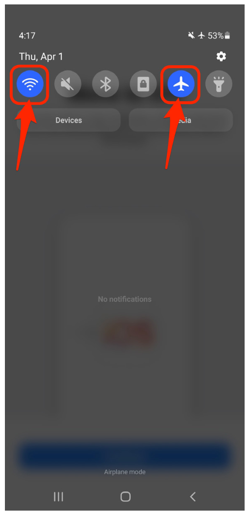 2. On your Android device, be sure that you're connected to Wi-Fi and plugged into power. Sometimes outside signals interrupt the transfer, so it can be helpful to turn your Android phone to Airplane mode while staying connected to your Wi-Fi.