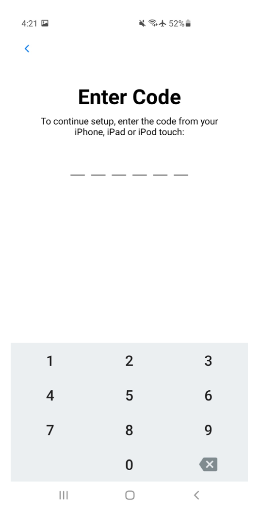 9. Then, on your new iPhone, tap Continue on the Move from Android screen. Wait for a code to appear on your iOS de vice. Once it does, enter that code on your Android device.