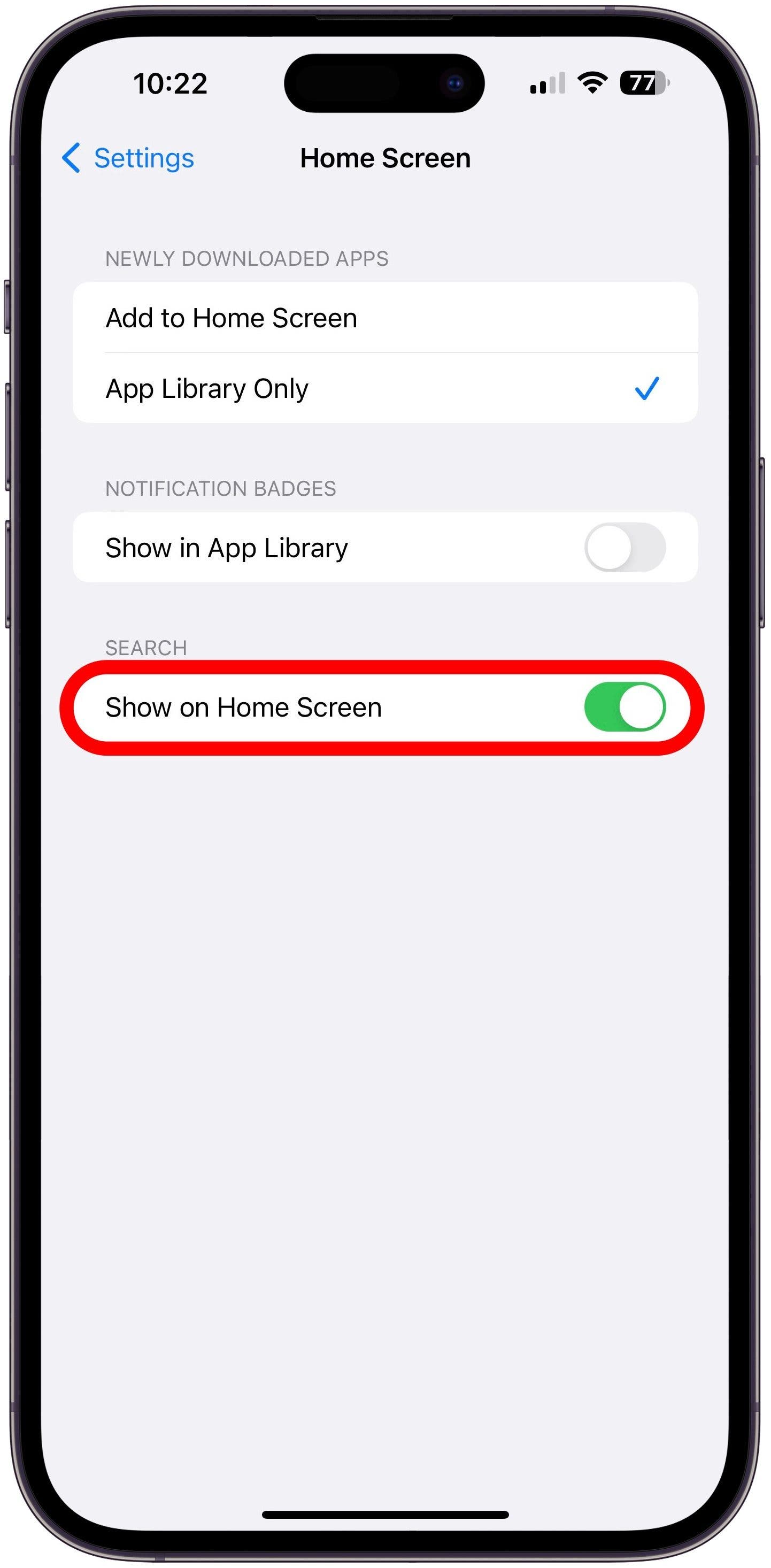 - Under Search, toggle Show on Home Screen to off. The feature will be gray when disabled and the Search Bar will no longer appear on your Home Screen.